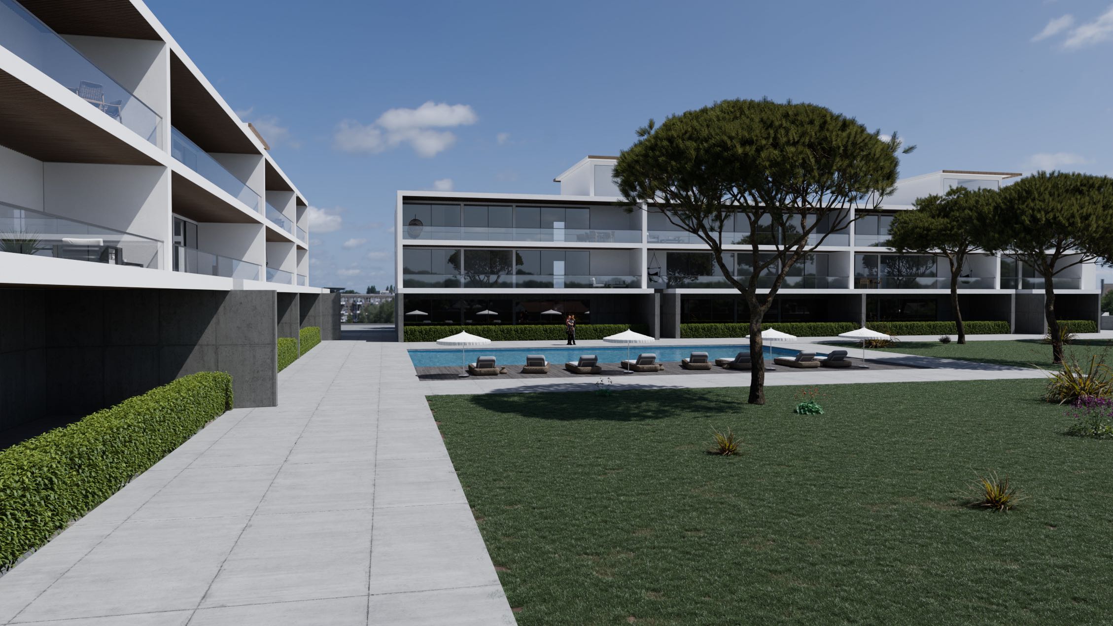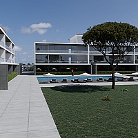 The beautiful luxurious condo in the heart of Monte Redondo in Leiria, Portugal is comprised of two identical volumes, each with a three-floor plan, offering ample space and privacy for residents. The condo is designed to face a beautiful swimming pool surrounded by lush landscaping, creating a serene and tranquil outdoor environment for residents to enjoy.